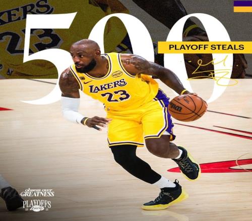 首节比赛,詹姆斯送出1次抢断,生涯季后赛抢断数正式来到500次里程碑,断层历史第一,排名第二的是皮蓬395次,乔丹376次历史第三。