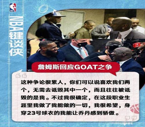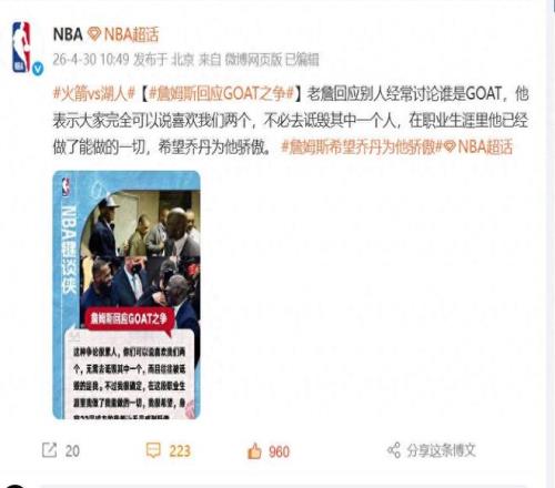 BA 官微一条动态,直接让篮球圈的 “舆论高压锅” 炸了 ——#火箭vs湖人#的比赛预热里,突然插播 #詹姆斯回应GOAT之争#的重磅采访,老詹对着镜头一本正经:“大家完全可以同时喜欢我和乔丹,没必要诋毁任何一个人,我已经做了职业生涯能做的一切,只希望乔丹能为我骄傲。”