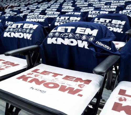 在季后赛到来的时候,每个座位上都被摆上了骑士队的T恤和毛巾,上面写着骑士队的季后赛口号:让他们见识。