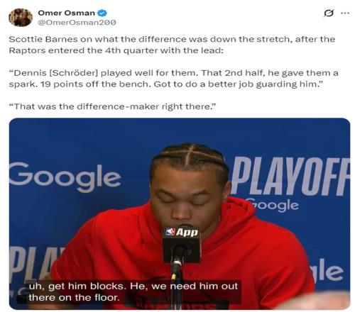 斯科蒂-巴恩斯在赛后的采访中谈到猛龙末节被逆转,他说道:施罗德为球队做出了贡献,下半场他就让球队变得更有活力,他在替补席就拿到了19分,我们以后必须在防守他时更努力,这就是此役的关键所在。