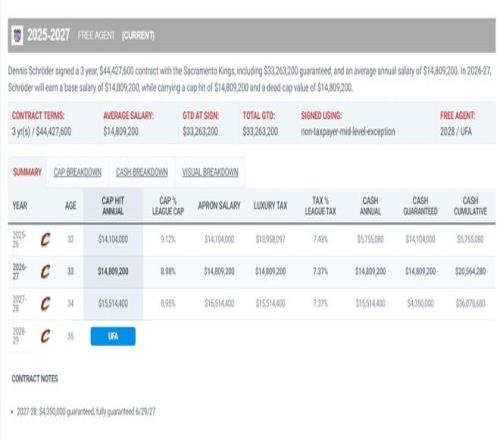 施罗德本赛季薪水只有1480万而已,而骑士队的先发五虎薪资加起来超过1.68亿,只能说骑士、国王、公牛的三方交易还是骑士队赢麻了。
