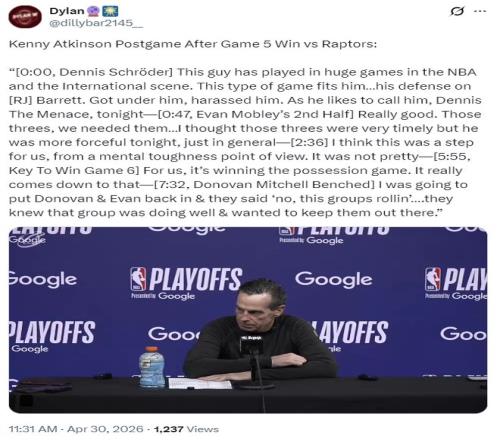 阿特金森在赛后的采访中自己打脸,他表示:这就是我们交易得到他的价值,这是我们常提到的事情之一,他在NBA赛场与FIB赛场都打过很多重要比赛,他就是一个大场面球员,他就是在这样的比赛中却给对手制造麻烦。【既然你知道他的价值,你还连续在末节DNP他?这说得过去】