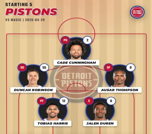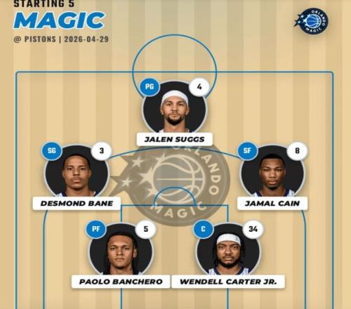 首发阵容方面,魔术队这边,弗朗茨-瓦格纳因小腿伤势缺阵,成为G5最大的变数,主帅排出的最新首发五人组为:萨格斯、贝恩、卡因、班凯罗、温德尔-卡特;活塞队这边,赫尔特缺阵,首发阵容则为:凯德-坎宁安、邓肯-罗宾逊、奥萨尔-汤普森、托拜厄斯-哈里斯、杰伦-杜伦。
